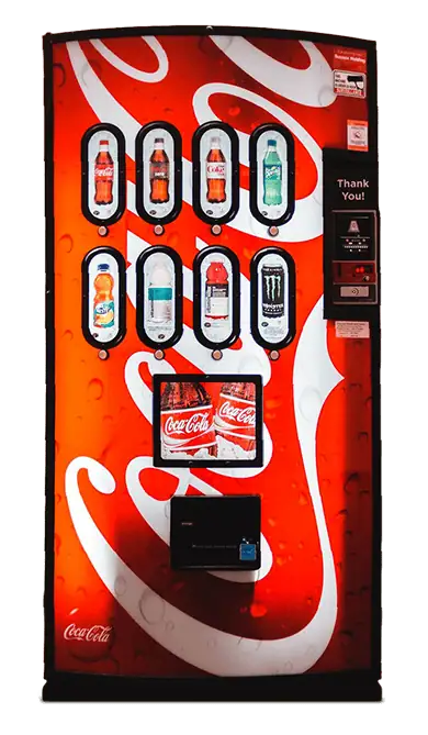 Dispenses drinks to customers after payment. It typically offers a selection of cold or hot beverages such as: Cold drinks: bottled water, soda, juice, iced tea, energy drinks. Hot drinks (in some models): coffee, tea, hot chocolate.